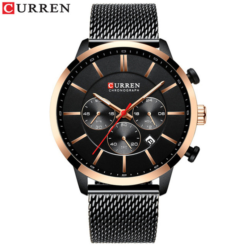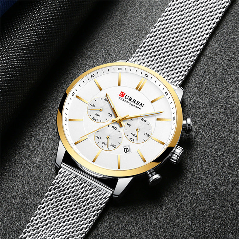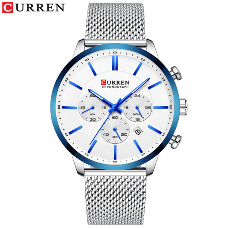The CURREN AeroMesh 8812 is a modern chronograph built for clarity and edge. Featuring a white dial with blue hour markers, gradient blue bezel, and three sub-dials for minutes, hours, and seconds, this watch delivers precision with style. The silver mesh band adds breathable comfort and a polished finish, while the date window and luminous hands ensure everyday functionality. Ideal for Ethiopia’s urban professionals and style-forward creatives. Available in multiple dial and strap combinations.