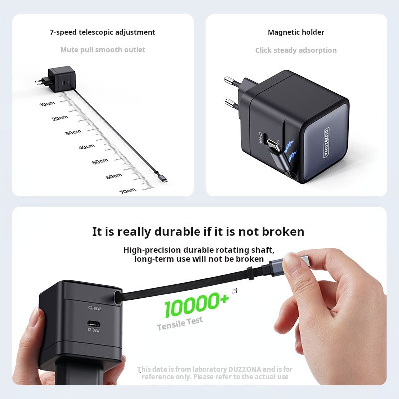 The GaN Flow Charger 65W revolutionizes power delivery with its Gallium Nitride technology, delivering ultra-fast charging in a sleek, travel-friendly design. Designed for professionals, students, and tech enthusiasts, this charger bundles a built-in telescopic cable to eliminate clutter while powering phones, tablets, and laptops at blazing speeds.