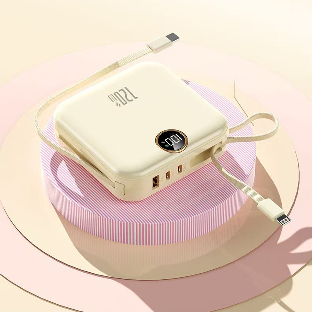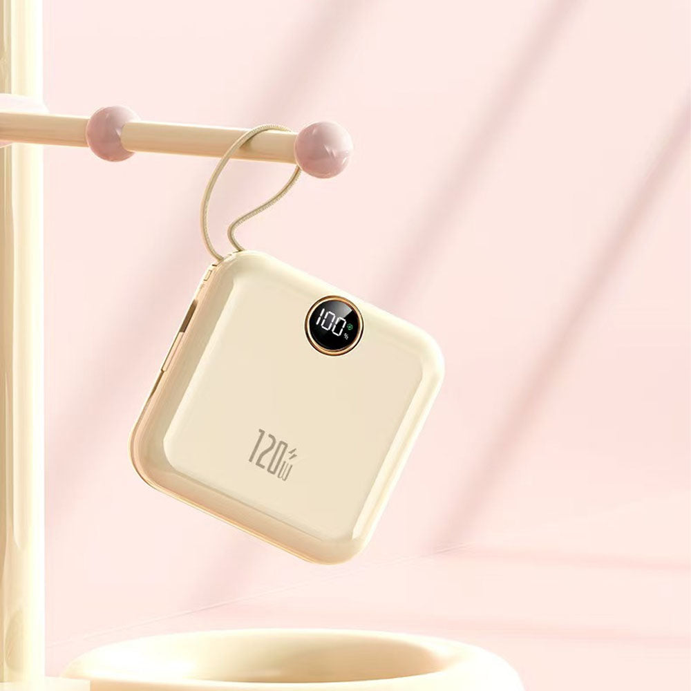 Meet your new travel essential: the Pocket Spark Fast Charging 120W Power Bank. This mini, incredibly cute device combines style with high-speed performance. It features a built-in dual-cable design (including a handy strap) for fast charging on the go, eliminating the need for extra wires. With a powerful 120W Max/PD20W output, it charges your devices super quickly. The smart digital display shows the remaining battery life at a glance. Compact and compliant with airline regulations, the Pocket Spark is the perfect, portable companion for your phone and other gadgets.