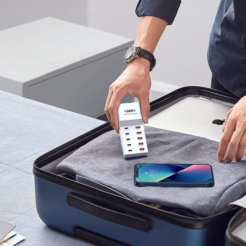 Introducing the PowerHive 50W 10-Port Smart Charger, a high-efficiency charging hub designed for modern needs. With built-in synchronous rectification and protocol chips, it ensures fast, stable, and safe charging for multiple devices simultaneously. Features include smart current matching to prevent battery damage, wide voltage compatibility (100-240V) for global travel, and PC fire-resistant casing for added safety. Enjoy 2x faster charging (60% in 28 minutes) and 10 ports (Type-C + USB) with multi-protection (overvoltage, overheating, short-circuit). Perfect for offices, travel, or home use.